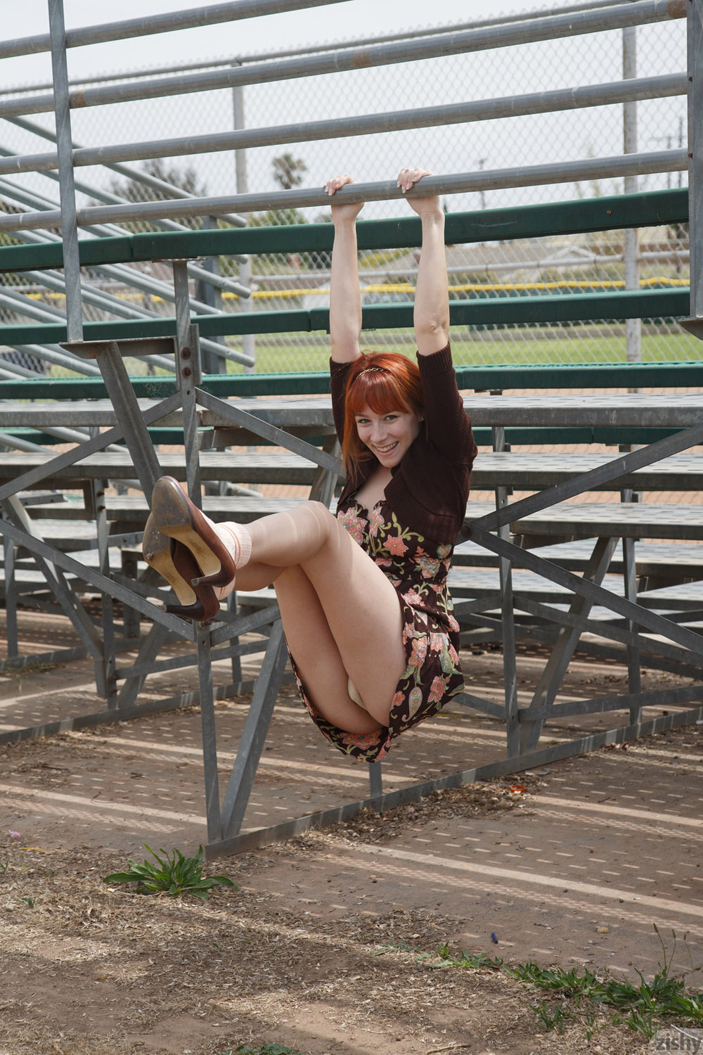 Penelope Lynn is that cute redhead in the short dress who bends over and shows off her tiny thong and round ass. That's called positive energy and she has a lot for Zishy today, going as a far as pulling aside her panties around letting her perky boobs out to play.