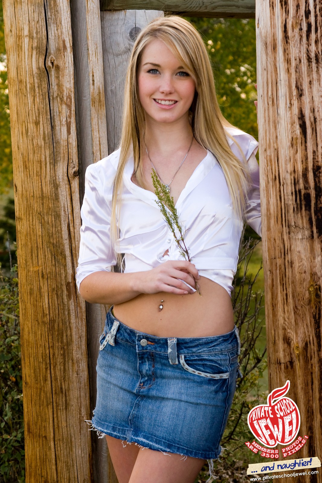 Private School Jewel is definitely a real girl next door, even a farm girl. Today she doesn't really do farm work but more important work that involves taking off her skirt and showing off her amazing bush.
