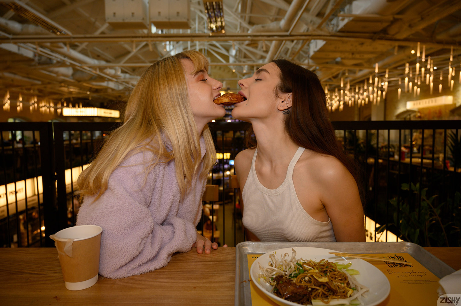 Rachel Veiss and Beglie Skipper are just two friends enjoying lunch while they flash their boobs and butt in this special Zishy set.