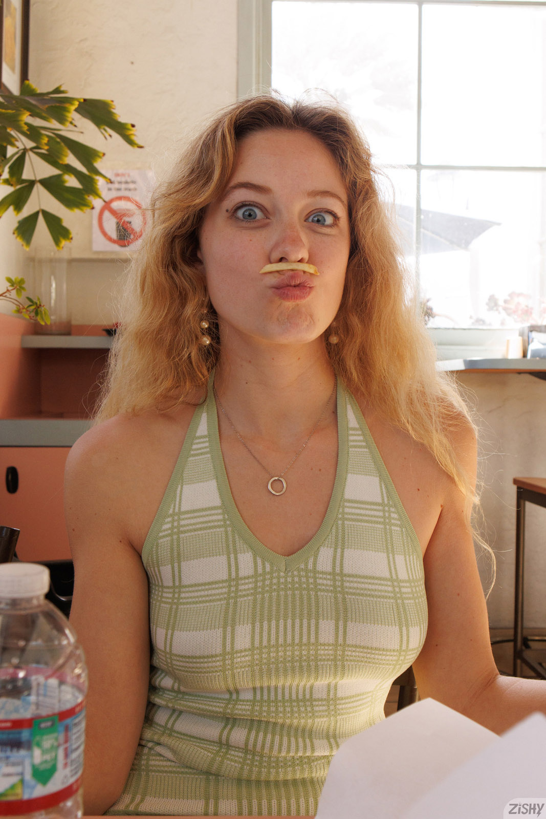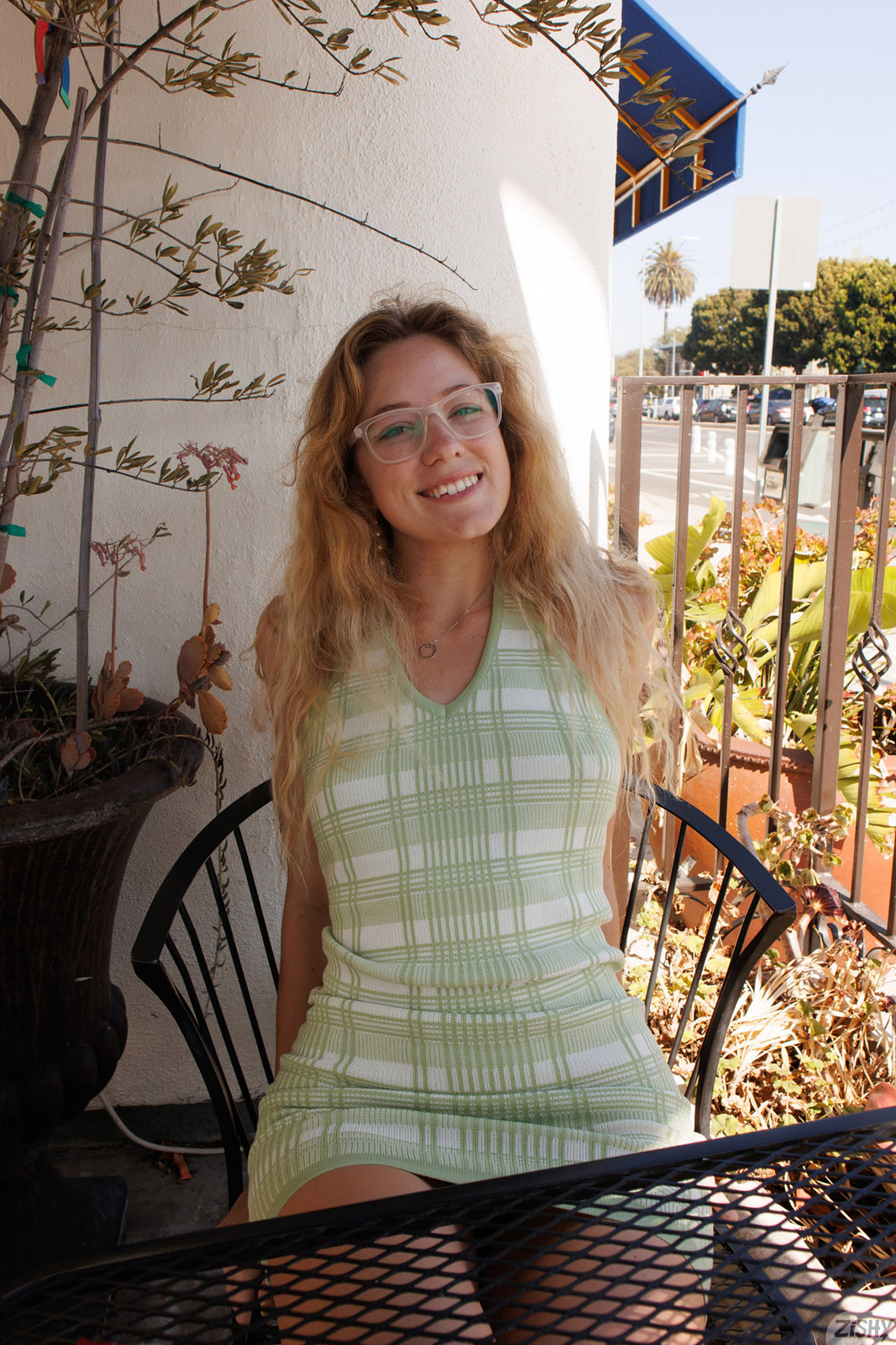 You can find River Lynn at the local cafe in her tiny dress while she flashes her black thong and nice ass in public on Zishy.