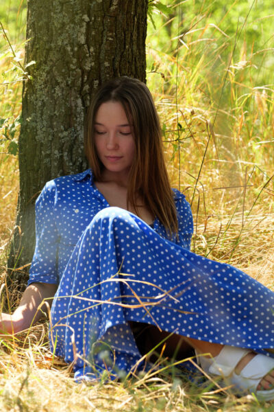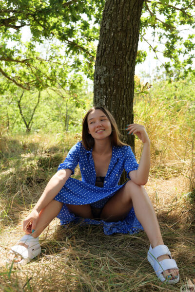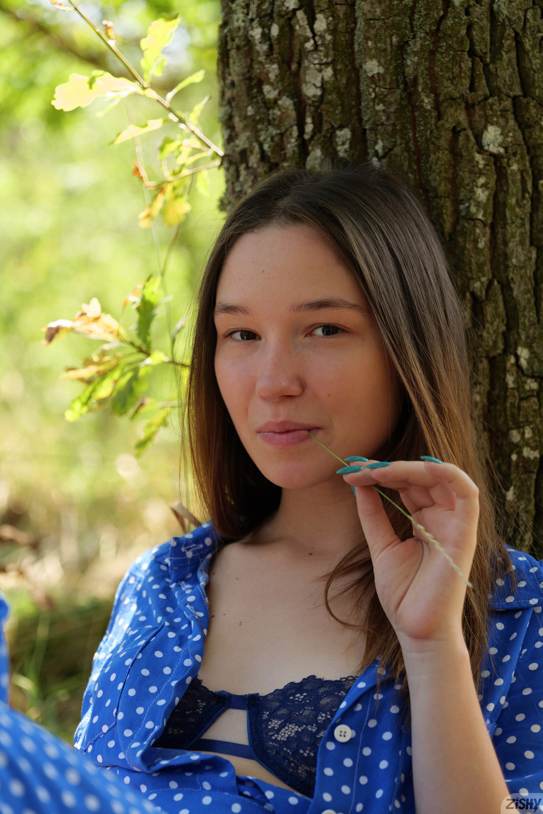 Sayah Heaney spends her earth day in the forest wearing a little blue dress so she can go topless and be one with nature on Zishy.