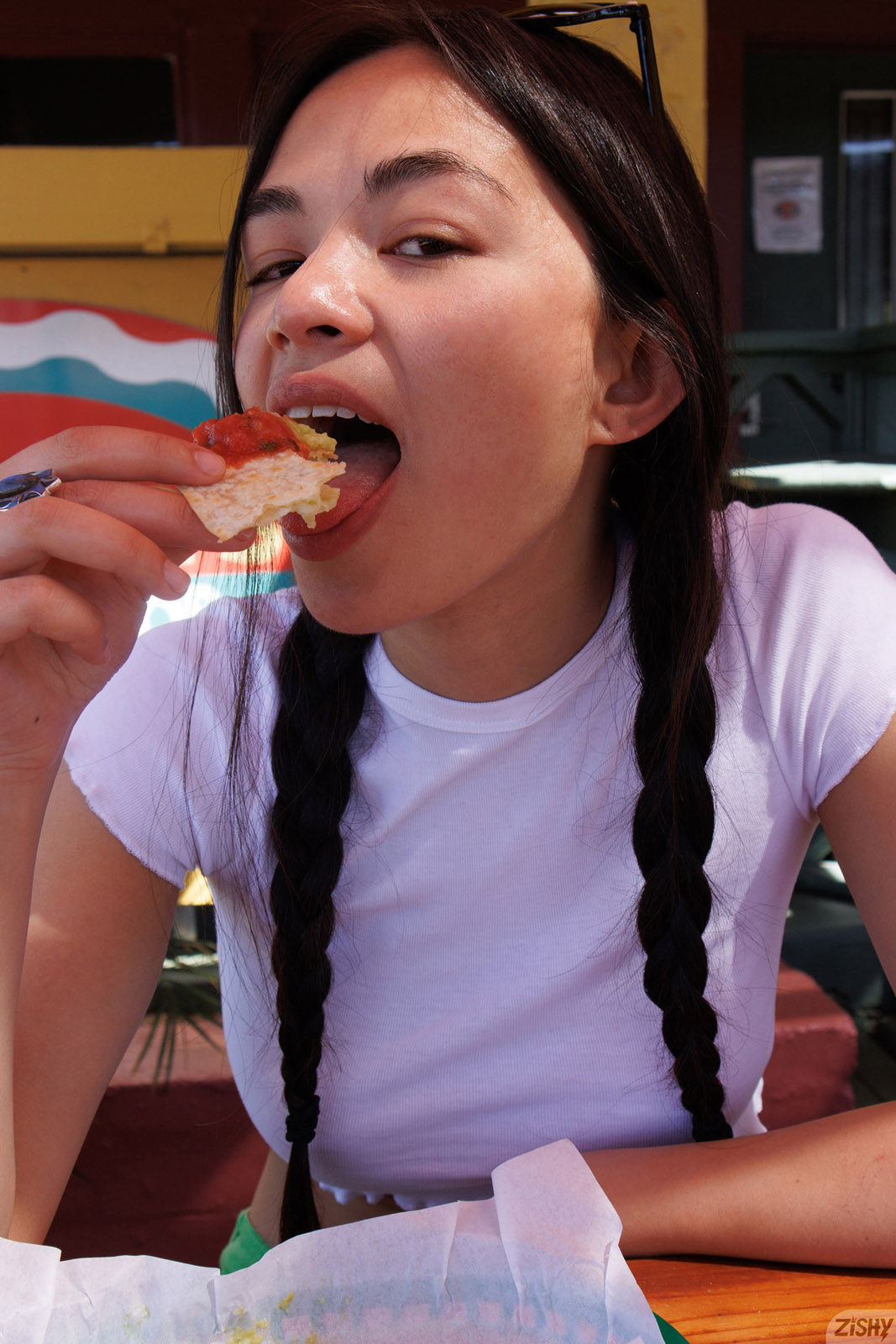 Scarlett Alexis likes her fresh guac with a side of boobs because this brunette beauty wants to show off her cotton panties on Zishy.