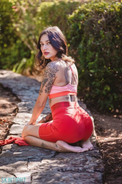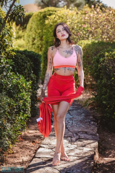 Seline P takes off her tight shorts on the vibrant pathway so she can just hang out naked outside for Skin Tight Glamour.