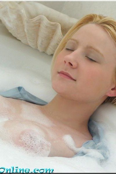 because bubbles are running down her boobs and she's actually rock hard.
