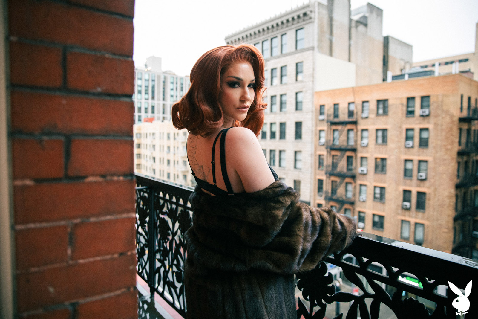 Skye Blue is out in the open on a balcony while she plays the blonde vixen clad in an open skirt with grabby hands on Playboy.