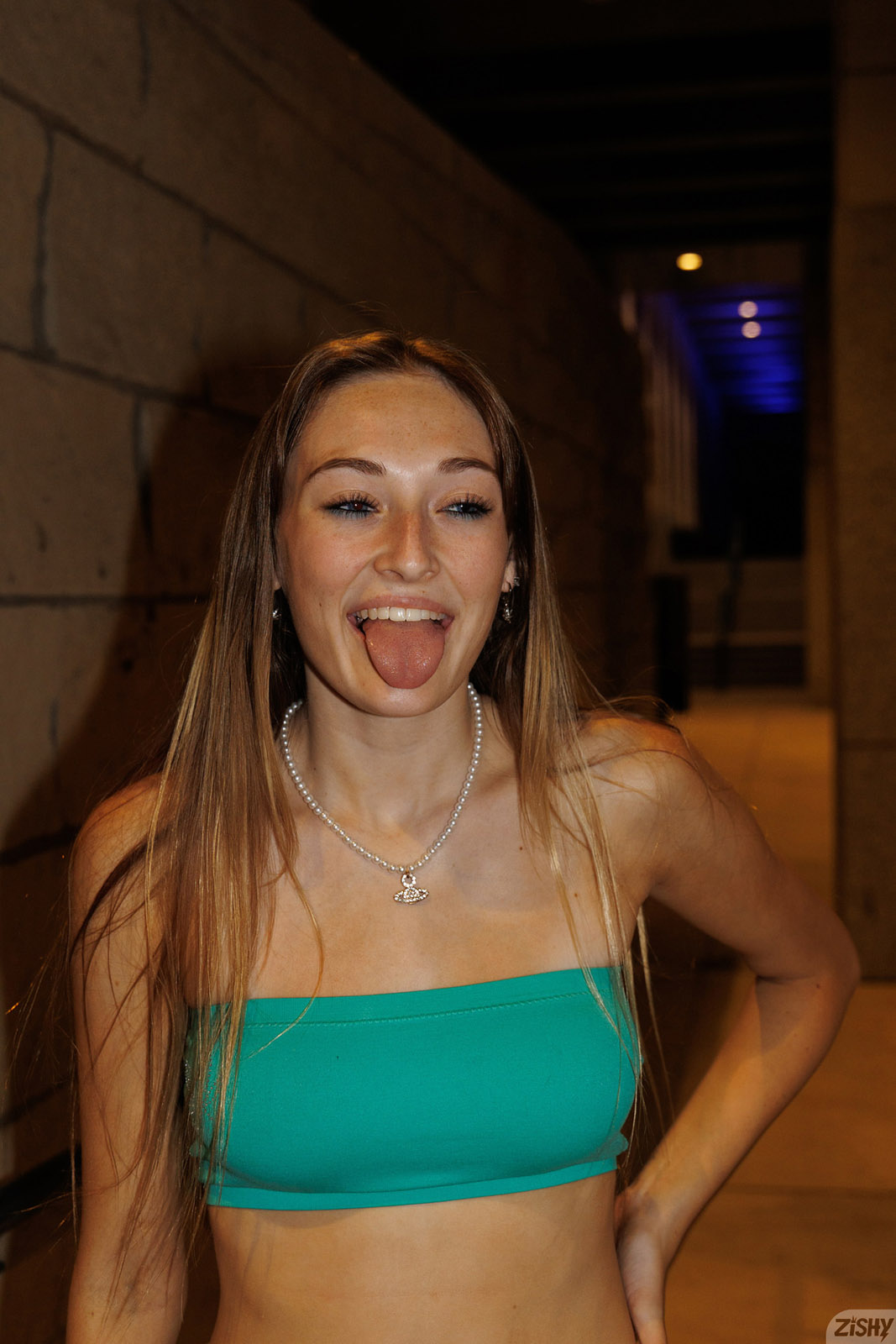 It's fun to watch Skyla Kirch pull down her tube top in public so she can have topless fun by an EV supercharger on Zishy.