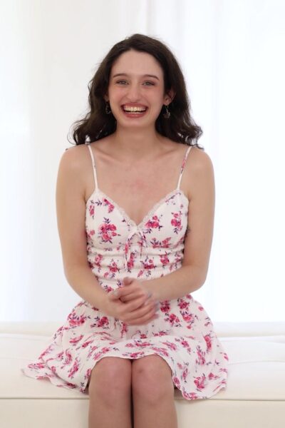 Thalia Hayes does her first audition by giggling and sliding off her cute flower dress to go on the ride of her life at Net Video Girls.