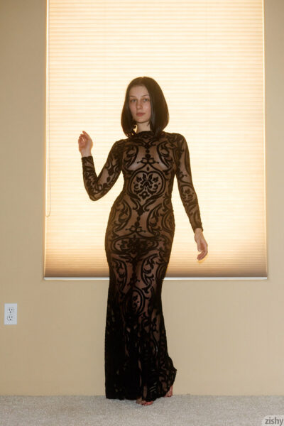 Tracy Maura loves wearing a sheer black dress before having some flexible fun in leggings while showing off her wet spot on Zishy.