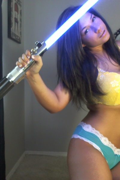 Victoria Raye has saber fever because of her new favorite movie, and I have it too! Maybe I just like seeing Victoria rub a phallic object all over her big bouncy boobs, or the fact that she's wearing sexy booty shorts that ride up her perfect butt.